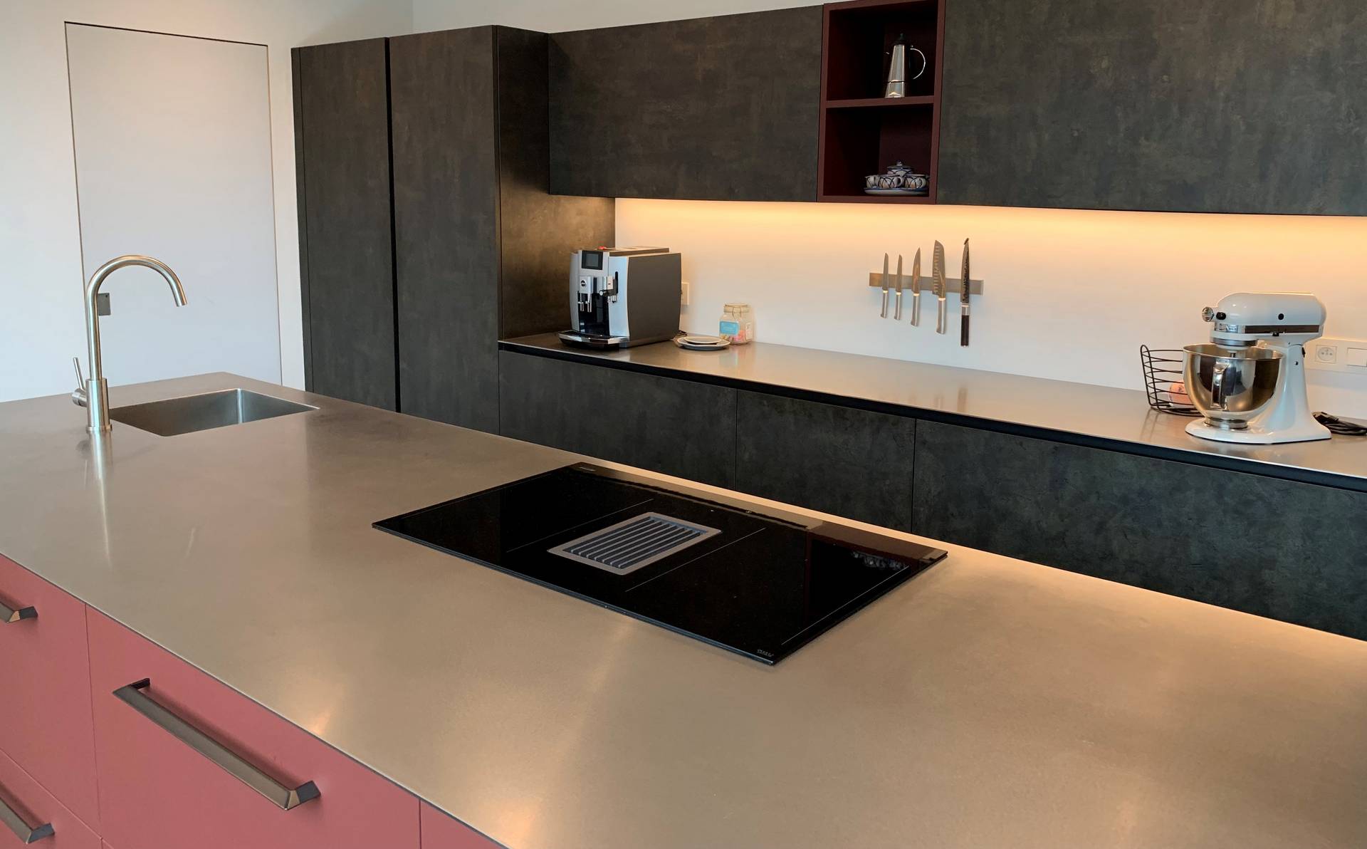 Slank, strak en elegant. Dit alles nog eens in het Rosso Jaypur van het ultra matte en fingerproof fenix laminaat. Voor het werkblad koos Sarina voor een 4 mm massief inox werkblad ( Barazza).